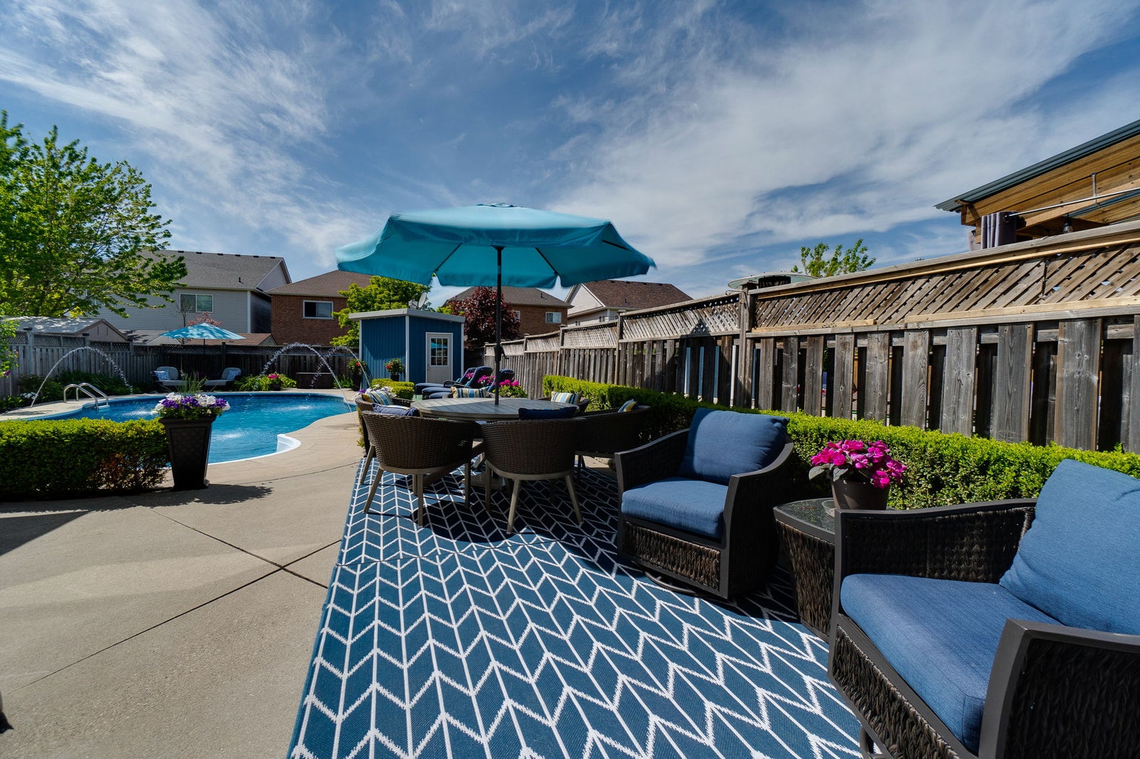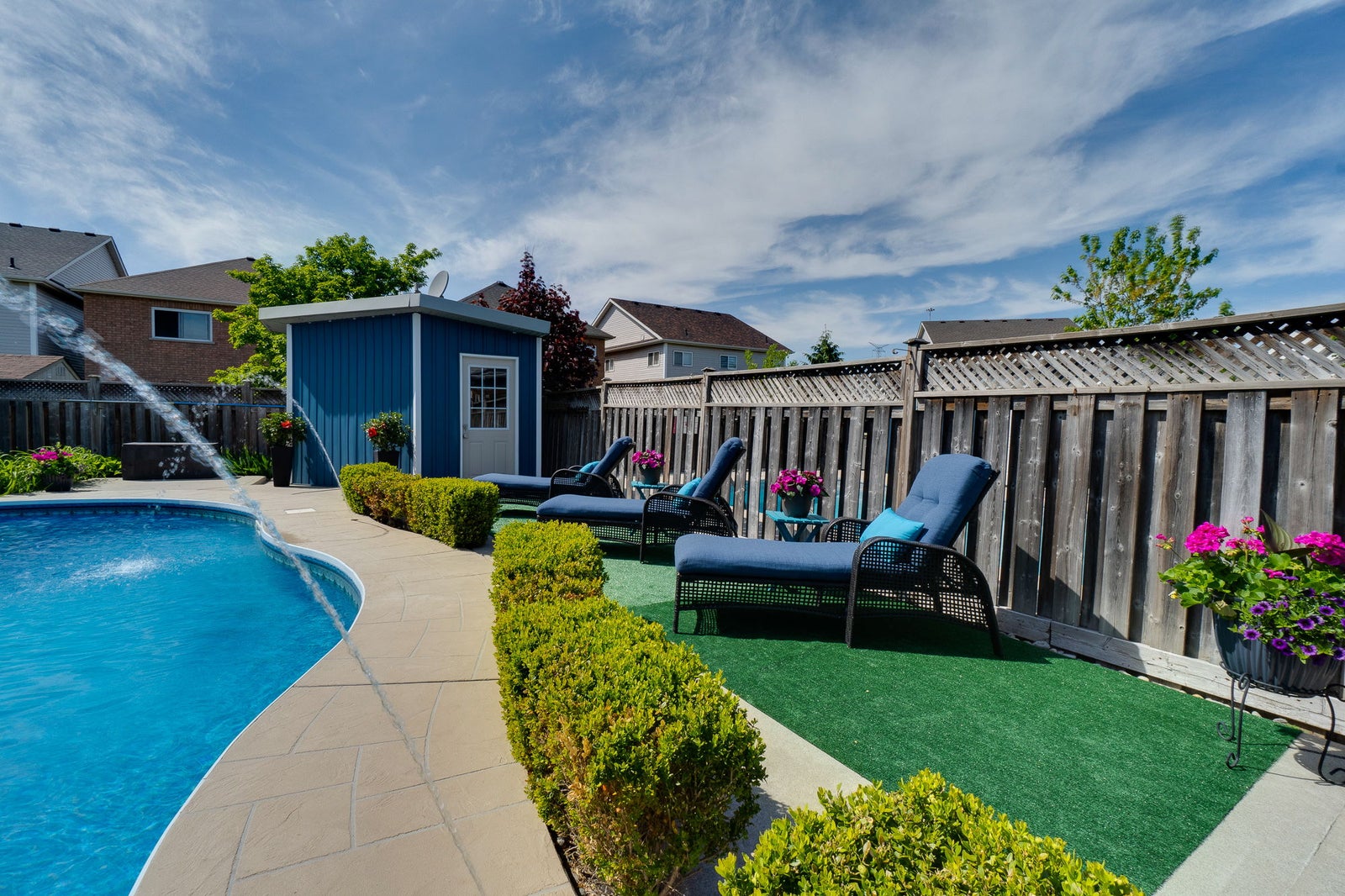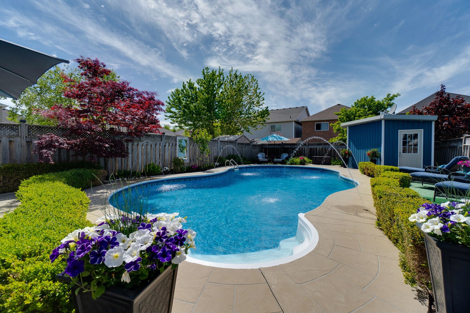 Upstairs you'll find a generous primary suite with sitting area, balcony, walk-in closet, and 4-pc ensuite, plus 3 more roomy bedrooms and a main bath. The finished basement adds a 5th bedroom, rec room, second living space, 3-pc bath, and a cozy home office nook.Enjoy summer in your private backyard with a heated pool, fountains, and space for a hot tub on a 140' deep lot. Conveniently located near schools, parks, shopping, GO transit, and Hwy 401.
